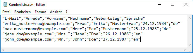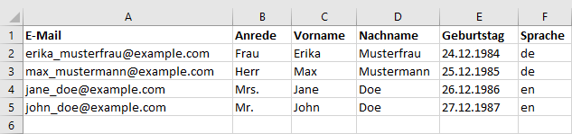 Abonnenten: ImportWahrscheinlich haben Sie bereits eine Liste von Adressen zusammengestellt, die Sie per Newsletter anschreiben möchten. Über das universelle CSV-Dateiformat lassen sich Ihre Adressen aus nahezu jeder Datenbank oder Tabellenkalkulation (z. B. Microsoft Office oder Open Office) exportieren und anschließend in ETRON E-Mail Marketing importieren. Um die Zuordnung der Spalten (z. B. Vorname, Nachname, E-Mail) beim Import zu erleichtern, sollte die erste Zeile Ihrer CSV-Datei aussagekräftige Spaltenüberschriftten enthalten. Ein Beispiel: