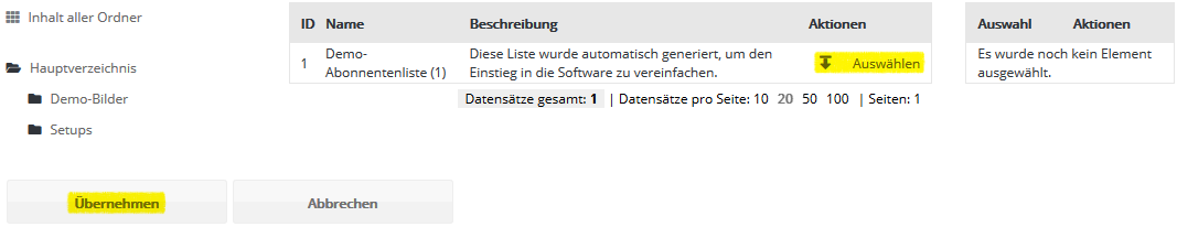 Schritt 3 - AbonnentenlistenWählen Sie nun aus, in welche ETRON E-Mail Marketing Abonnentenliste ihre CSV-Datei importiert werden soll. Falls Sie zuvor keine eigene Abonnentenliste in ETRON E-Mail Marketing angelegt haben (siehe Menü Abonnentenlisten), steht zum schnellen Einstieg die leere Abonnentenliste 'Demo-Liste' bereit. Diese Liste wird in der Regel bei der Einrichtung Ihres ETRON E-Mail Marketing Kontos angelegt und zur Demonstration mit einem Beispiel-Abonnenten befüllt.