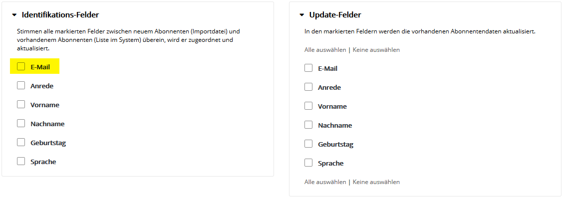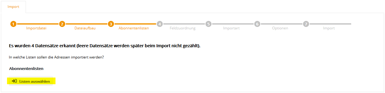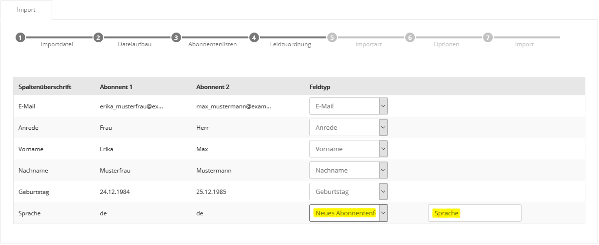 Auch die Auswahl mehrerer Abonnentenlisten ist möglich, falls Sie parallel in mehrere Listen importieren möchten. Klicken Sie nach Auswahl der gewünschten Liste(n) auf 'Übernehmen' und anschließend auf 'Weiter'. Der Name einer Abonnentenliste lässt sich im Menü Abonnentenlisten auch nachträglich jederzeit ändern. Schritt 4 - FeldzuordnungIn Schritt 4 teilen Sie ETRON E-Mail Marketing mit, welche Spalte (z.B. Vorname, Nachname) Ihrer CSV-Datei in welches ETRON E-Mail Marketing Abonnentenfeld importiert werden soll. Zum schnellen Einstieg sind typische Abonnentenfelder wie 'E-Mail', 'Anrede', 'Vorname' und 'Nachname' in ETRON E-Mail Marketing bereits vorhanden.