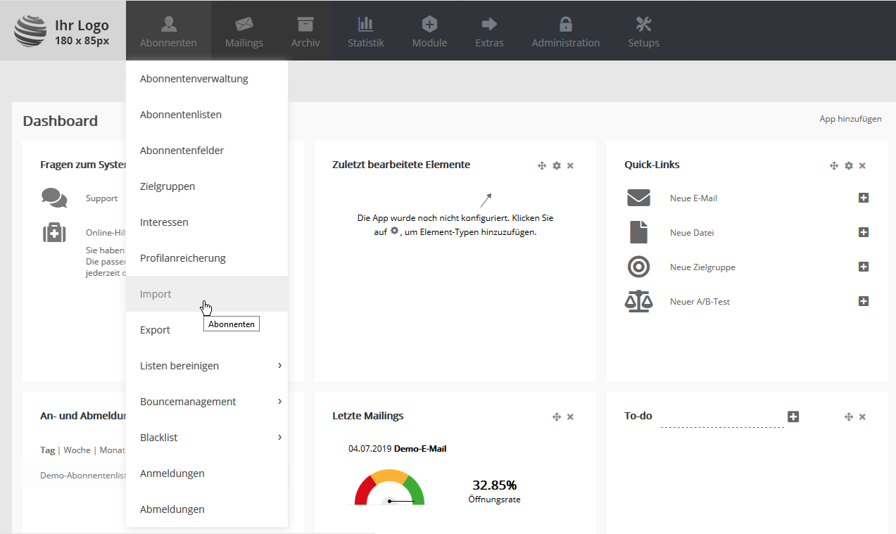 Zum Abspeichern Ihrer Daten wählen Sie bitte je nach Version Ihres Office-Paketes das Exportformat CSV UTF8 (Trennzeichen-getrennt) oder CSV (Trennzeichen-getrennt). Import Schritt für Schritt erklärtUm Ihre CSV-Datei in ETRON E-Mail Marketing zu importieren, wählen Sie im Menü 'Abonnenten' den Punkt 'Import':
