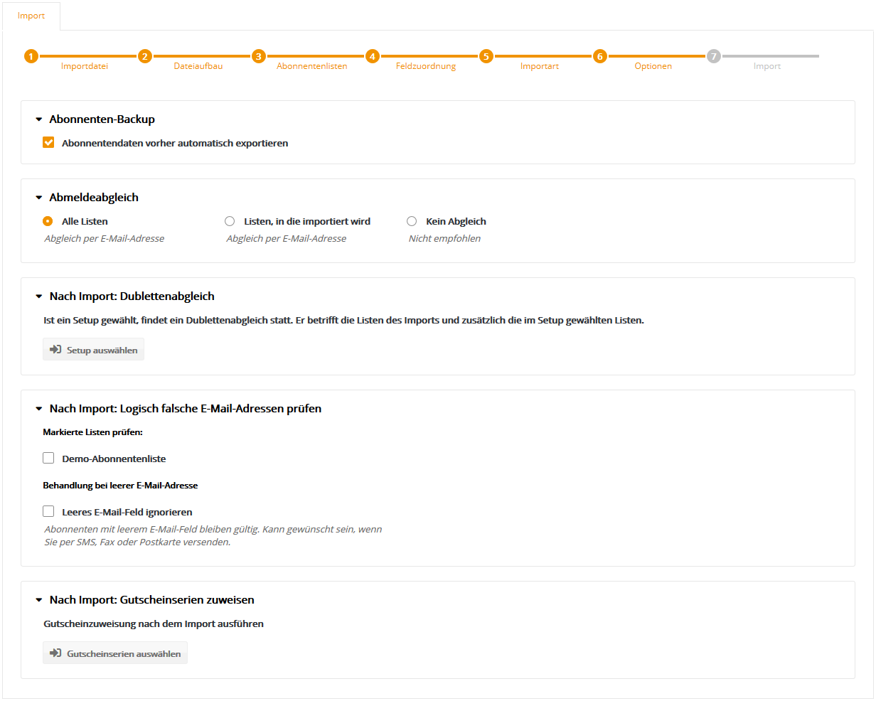 Anhand welcher Daten ein Abonnent als 'bereits vorhanden' erkannt wird (z.B. Kundennummer oder E-Mail Adresse), legen Sie anschließend in Schritt 6 - Optionen fest. Klicken Sie auf 'Weiter'. Schritt 6 - OptionenHier legen Sie die letzten Details zum Import fest.
