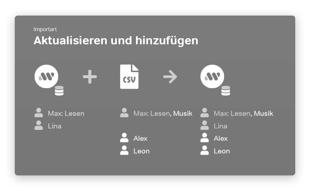 In Verbindung mit der Option 'In der Importdatei fehlende Empfänger aus dem System löschen' erreichen Sie eine Funktion ähnlich 'Importart: Ersetzen', jedoch inklusive Erhalt vorhandener Abonnenten. Das heißt: Der neue Inhalt der CSV-Datei wird komplett übernommen, jedoch werden im Gegensatz zu 'Importart: Ersetzen' bereits vorhandene Abonnenten erkannt und ihr bisheriges Nutzerverhalten (Öffnungen, Klicks, Bounces) bleibt erhalten. Mit dieser Option würde im Beispiel Max aktualisiert (+Musik), Alex und Leon werden hinzugefügt. Lina wird entfernt, weil Sie in der CSV-Datei fehlt. |