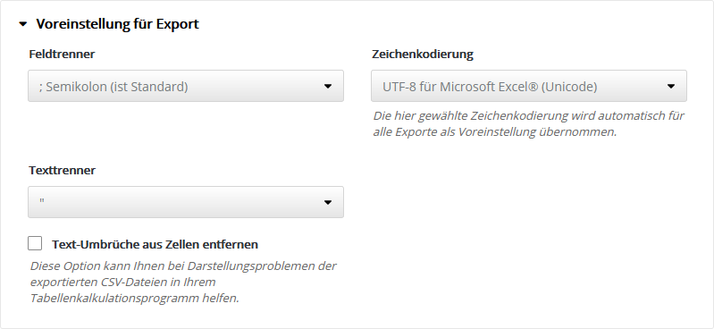 Folgende 'HTML-Editoren' sind in ETRON E-Mail Marketing integriert und nutzbar: Grundeinstellung ExportHier legen Sie die Voreinstellung für den Export von CSV-Dateien fest, z. B. für den Export von Abonnentendaten. Bei der Durchführung jedes Exportes können Sie bei Bedarf auch eine abweichende Einstellung wählen. Standardeinstellung ist die Option 'UTF-8 für Microsoft Excel® (Unicode)', technisch gesprochen 'UTF-8 mit BOM'. Dieses Format wird von den meisten Officeanwendungen automatisch erkannt, so dass Umlaute und Sonderzeichen ohne manuelle Formatwahl korrekt importiert werden. StatistikeinstellungenTragen Sie Ihre eigenen Maximalwerte ein, um die rot|gelb|grün Farb-Umschaltung der Statistik-Anzeige für Öffungsrate, Klickrate und Bouncerate an die typischen Werte Ihrer Mailings anzupassen. Nur Ihre besten Mailings sollten den grünen Bereich erreichen. Die Farb-Umschaltung erfolgt automatisch in Drittel-Stufen des eingetragenen Maximalwertes. Empfehlung: Notieren Sie aus der Statistik Ihrer bisherigen Mailings die Durchschnittswerte für Öffnungsrate, Klickrate und Bounces. Damit dieser Durchschnittswert zukünftig im mittleren Drittel der Skala landet, tragen Sie das Doppelte dieses Wertes als Maximum in das jeweilige Feld ein. Tragen Sie z. B. 30% als Maximum ein, dann werden anschließend die Werte bis 10% rot, bis 20% gelb und darüberliegende Werte grün gefärbt. Sie sehen sofort, ob Ihr aktuelles Mailing über- oder unterdurchschnittlich abschneidet. Typische Durchschnittswerte: