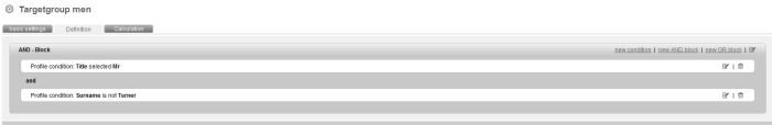 By inserting 'AND -' as well as 'OR – blocks' you can determine one or more concrete conditions on the target group. You can introduce as many conditions and blocks as you need. Determined blocks may, of course, be 'Edited' or 'Deleted' later on. Consider the target group example 'Men':