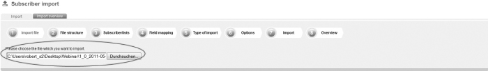 Save the file as a file with the feature 'CSV (Comma delimited)'. Apple user: If you own an apple computer, you will have to safe the file as 'CSV-Windows'. ETRON E-Mail Marketing does not run files in the Mac format. Step 1 – Import fileOn the navigation bar click on 'Subscribers' and then go to the navigation subitem 'Import'. This is the way how you get to the menu-guided import function of ETRON E-Mail Marketing. First, you will have to choose the file which you want to import; |