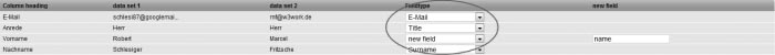 if the first line of your address file contains (as shown in the example above) the column headings, leave the item 'First line contains column headings' marked . Otherwise, if your address file starts right away with the subscriber data, unmark this option. Step 3 – Subscriber ListsChoose the subscriber list to which you want to import the addresses. Subsequently click on 'Next'. Step 4 – Field MappingNow you are asked to match the field names of your subscriber data with those of ETRON E-Mail Marketing. In order to do so, please choose in the drop down menus the associations which correspond to field information displayed to the left of these menus. If there does not exist a matching subscriber field, choose 'New Field' and enter a name for the subscriber field that needs to be created. Click 'Next'.