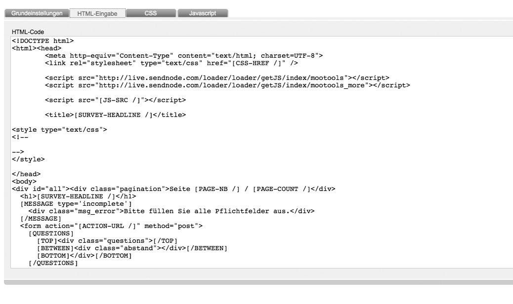 Insert your entire html source code. By creating a new template, ETRON E-Mail Marketing generates a sample html source code with all important survey-placeholders automatically in this tab.