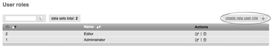 Administrate rights for your users through 'user roles' in 'ETRON E-Mail Marketing'. All your already existing users are listed in a clear table. You can edit an user role by clicking the icons of editing or deleting. |