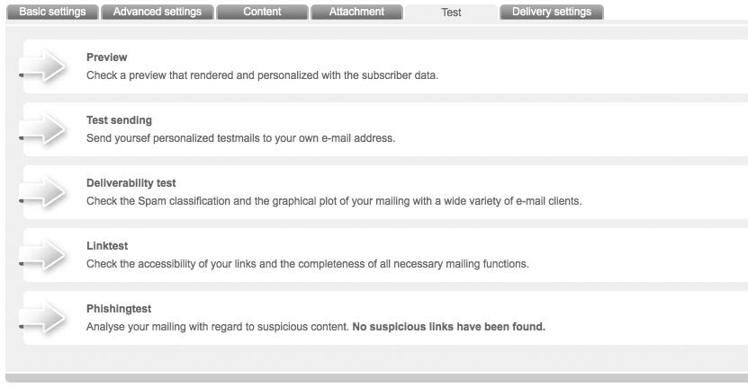 Having finished your newsletter, ETRON E-Mail Marketing offers you numerous testing possibilities. This helps you to optimize your mailing and achieve maximum success before actual dispatch. You can get to the testing functions by choosing the tab 'Test' in the menu in which you edit your mailing. Following tests are available: |