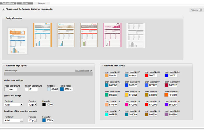 Now you also can adjust the design of your report. Choose the tab 'designs'. By default ETRON E-Mail Marketing suggests you six different layouts. HTML experts can also open the 'advanced settings' below the layouts to edit the html-code. For example you can insert your logo in th header.