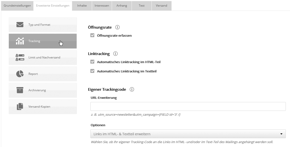 ÖffnungsrateUm nach dem Versand auszuwerten, wieviel Prozent der Empfänger das Mailing geöffnet haben (siehe 'Übersicht, Öffnungs-/Klickrate'), muss die Option 'Öffnungsrate erfassen' aktiviert sein. Dazu integriert ETRON E-Mail Marketing im HTML-Teil des Mailings ein unsichtbares Zählpixel, welches für jeden Empfänger individuell verlinkt ist und dessen Aufruf als Öffnung gezählt wird. Die Messung funktioniert unabhängig von der Mailing-Einstellung 'Inboundimages', solange der Empfänger die Anzeige von Bildern in seinem Posteingang nicht unterdrückt. Hinweis: Ist die Erfassung der Öffnungsrate deaktiviert, aber die nachfolgende Option "Linktracking" aktiviert, dann werden Klicks automatisch auch als Öffnung gewertet. Die Öffnungsrate erfasst in dem Fall nur den Teil der Öffner, der irgendeinen Link angeklickt hat. LinktrackingAktivieren Sie Automatisches Linktracking im HTML-Teil, so wird jeder im Mailing enthaltene Link durch einen Tracking-Link ersetzt, der für jeden Abonnenten individualisiert ist. Diese Tracking-Links werden über den ETRON E-Mail Marketing-Server auf die ursprüngliche Link-URL umgeleitet und dabei gezählt. Damit können Sie nach Versand des Mailings sehen, wie oft jeder Link angeklickt wurde (siehe 'Übersicht, Öffnungs-/Klickrate'). Weiterhin lassen sich darauf basierend Zielgruppen bilden, z. B. "Alle, die Link B angeklickt haben" können erneut mit weiteren Informationen angeschrieben werden. Bitte beachten Sie, dass Sie jede URL vorher als Link definieren müssen. Sie können die Richtigkeit der Tracking-Links überprüfen, indem Sie sich ein Testmailing zusenden. Eigener Tracking-CodeHier ist es möglich, alle Links des Mailings automatisch um eigene Parameter zu erweitern. Damit lässt sich das weitere Verhalten der Newsletterempfänger per Website-Analyse-Tools wie z.B. Google Analytics, Piwik oder econda tracken. Kopieren Sie dazu den Tracking Code Ihres Tools in das Feld, damit ETRON E-Mail Marketing ihn automatisch an alle externen Links Ihres Mailings anhängt. Folgende Parameter werden unterstützt: