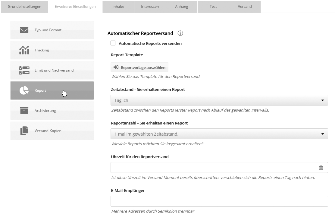 Hier bestimmen Sie, wann und wie oft ein automatischer Report an Ihre E-Mail-Adresse gesendet wird. Aktivieren Sie dazu die Checkbox 'Automatische Reports versenden'. Das lässt sich übrigens auch nach Versand der E-Mail nachholen, nachdem sie bereits in das Archiv verschoben wurde. Wählen Sie das gewünschte Report-Template (Bearbeitung siehe 'Statistik' --> 'EMail' --> Mailings). In den Einstellungen für Reportintervall und Anzahl der Wiederholungen legen Sie fest, aller wieviel Tage und wie oft insgesamt Sie den jeweils aktuellen Report erhalten möchten. Abschließend wählen Sie Zustellungszeitpunkt (Uhrzeit) und E-Mail-Empfänger des Reports. Um den Report an mehrere Empfänger zu senden, geben Sie mehrere E-Mail-Empfänger getrennt durch Komma, Semikolon oder Leerzeichen ein. Erweiterte Einstellungen: Archivierung
