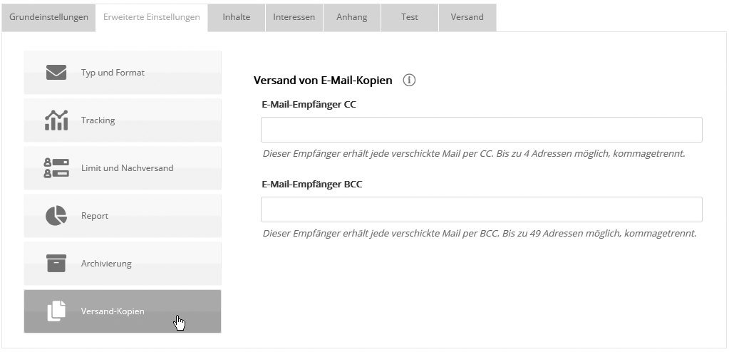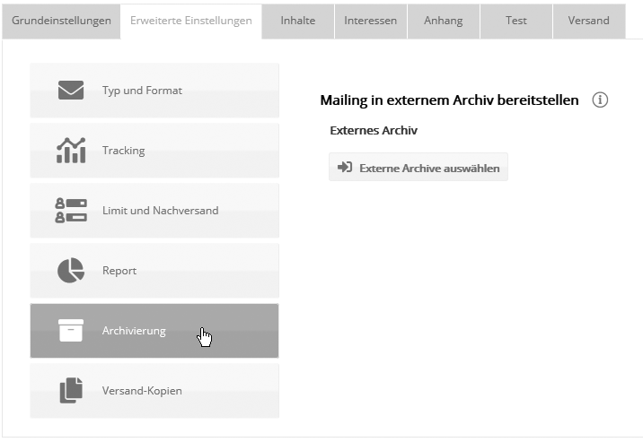 Externes ArchivWählen Sie ein bereits angelegtes externes Archiv aus, in das Ihr Mailing nach Versand automatisch eingebunden werden soll. Sie können Mailings auch noch nach dem Versand einem Archiv zuweisen. (Dies ist allerdings nur möglich, wenn Sie bereits ein externes Archiv angelegt haben.) Weitere Informationen finden Sie unter Externes Archiv. Erweiterte Einstellungen: Versand-Kopien
