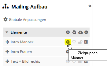 Die Symbole zum Bearbeiten eines Elementes (Artikels) sind im Mailing-Entwurf und Elementbaum identisch: