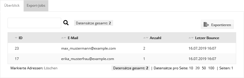 Sollte der Inhaber einer zurückgehaltenen E-Mail-Adresse mit Ihnen Kontakt aufnehmen und um erneute Zustellung Ihrer Newsletter bitten, wenden Sie sich bitte an Ihren Administrator. Dieser kann die Adresse nach entsprechender Prüfung wieder aktivieren. Hinweis: Die ID in der ersten Spalte ist keine Abonnenten-ID, sondern lediglich die ID des Eintrages auf der 'Retained List'. Reiter 'Export-Jobs'Nachdem Sie auf dem 'Überblick'-Reiter auf 'Exportieren' geklickt haben, wird nach Fertigstellung des im Hintergrund ablaufenden Export-Jobs die erzeugte CSV-Datei zum Download angeboten. |