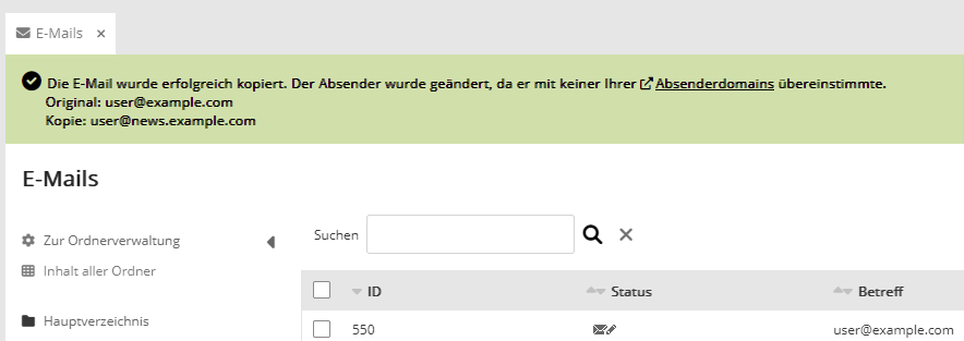 Selbstverständlich lässt sich die Absenderadresse der Mail-Kopie anschließend manuell ändern (vorausgesetzt, die gewünschte Absenderdomain wurde zuvor angelegt).